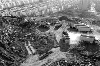 6月1日,广西防城港市,众多车辆在挖山造城。图/CFP
