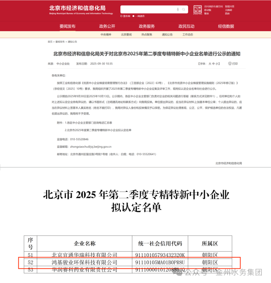 近日,北京市经济和信息化局正式公布2025年第二季度北京市“专精特新”中小企业名单,湖北联投东湖高新集团鸿基骏业环保科技有限公司(以下简称“鸿基骏业”)凭借在智慧管网领域的深厚技术沉淀、持续领先的创新能力与亮眼的市场表现,成功通过严苛认定,荣耀跻身榜单。这一荣誉不仅是企业发展历程中的重要里程碑,更是北京市政府对鸿基骏业公司技术实力与未来潜力的高度认可。