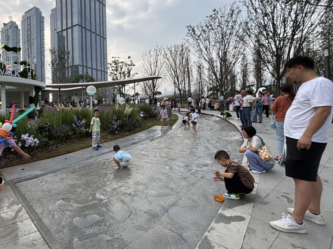 在武汉滨江天街户外绿地公园,孩子们赤脚在水中嬉戏,欢笑声不绝于耳。栾嘉雯 摄