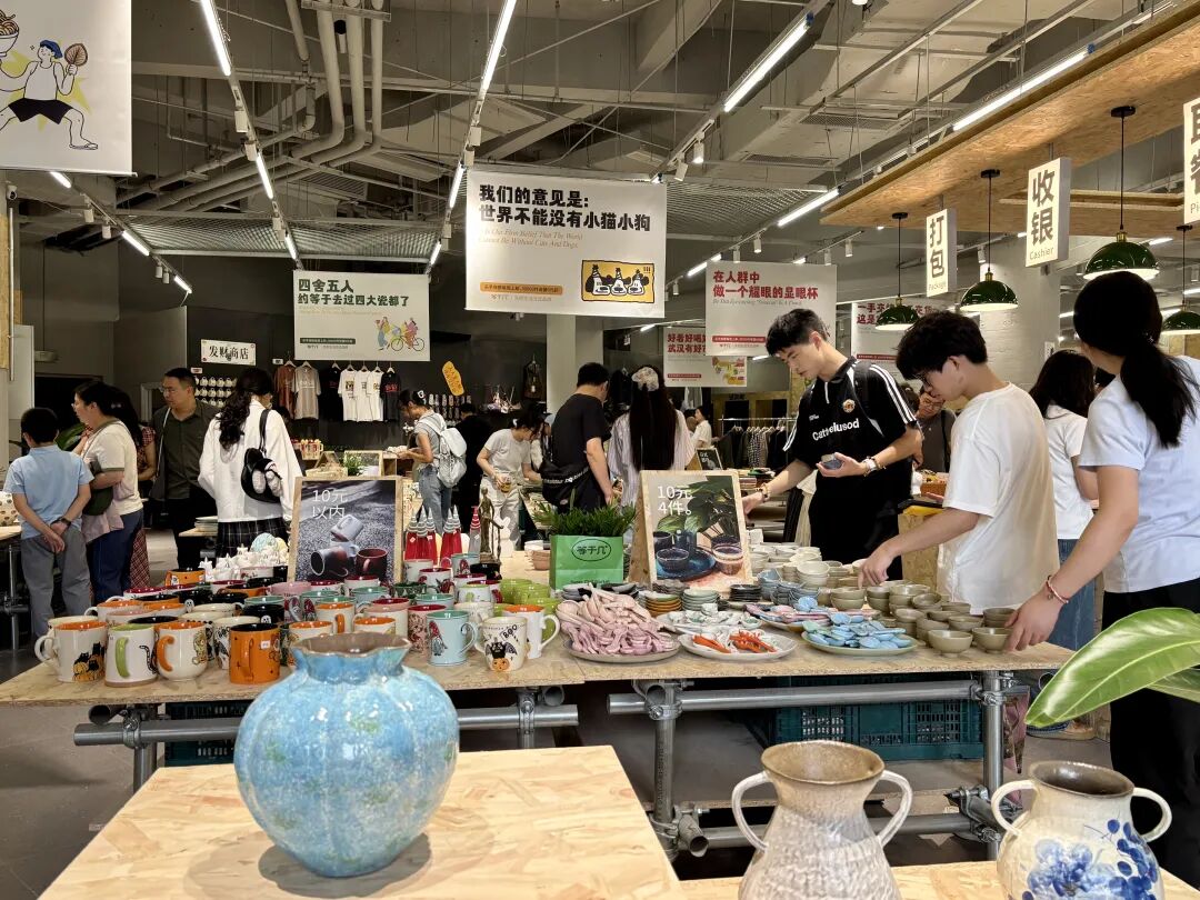 在等于几(捡瓷)市集,从马克杯、碗碟等日常器皿到手链、冰箱贴等精巧饰品,各式各样的陶瓷琳琅满目。市民张女士沉浸其中,感受着“捡瓷”的独特趣味:“手工艺品即使器型相同,细节处也总有独属于自己的印记。在这里哪怕挑上一小时,也不觉得浪费时间。”